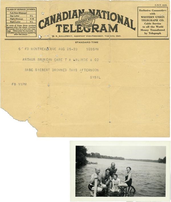 One of the best defensemen of his era, Earl Siebert was an NHL All Star with the Montreal Canadiens known as a great shot blocker and rugged player. Siebert retired as a player after the 1938-39 season, and tragically drowned in August 1939 just before assuming the coaching duties of the Montreal team. This Canadian National Telegraph and Cable Company telegram was sent to Babe Siebert's mistress the afternoon he died. The telegram has both vertical and horizontal folds throughout, the lower left corner is torn off and missing, otherwise in GD condition. Accompanying the photo is a 3 1/2" x 5" black and white photo of Babe Siebert with two men and two women swimming in the lake in which he drowned. The photo is EX.