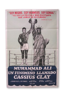 Attractive 27x41" monolith for the film AKA Cassius Clay. From the original 1970 Argentina release, these stone litho graphics are lively and vibrant. Outstanding image of Cassius Clay with the Statue of Liberty. Some tape on two reverse edges, o/w EX+. A nice clean copy.