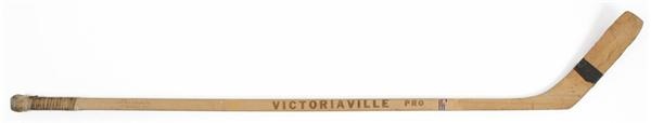 Used by the greatest defenseman to ever play hockey, this 1969-70 Victoriaville Pro stick is fantastic. This is the model Bobby Orr used throughout the season that finished with his famous “Flying Goal.” The blade is taped with just a few wraps in Bobby’s signature style. The stick is also taped in aged white wrap running approximately 6 inches down the handle. Factory stamped “ORR” with no cracks or damage. The celluloid accent taping is in blue stripes and provides dating to this stick (beginning in 1970-71 the accent was in the Bruins’ team colors). Orr’s number “4” is written on the stick in black marker. 1969 marked Orr’s switch from Northland to Victoriaville. The stick shows great use; the blade is slightly chipped at the edges and the accent taping is partially worn off. A fantastic example used by a true hockey legend.