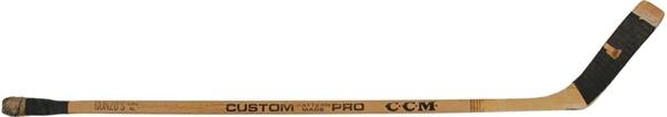 Bobby Hull had perhaps the fastest shot ever in hockey, with one of the pucks he shot being clocked at 120 mph! Hull played for 23 seasons with the NHL Chicago Blackhawks and the WHA Winnipeg Jets, and retired in 1980 after a short stint with the Hartford Whalers. The 12-time All Star finished his playing days with 610 NHL career goals. This CCM Custom Pro stick is a fantastic example of that. The knob and the first 6 inches of the handle are taped, as is the heavily “banana” curved blade. "Hull" and other manufacturers and distributors stampings are in black ink. On one side of the stick there is an inscription "To Brian Best Wishes" and Hull's autograph in black marker grading a 7 of 10. The stick shows good game use with the tape worn off in several spots, and two small cracks at the tip of the blade. Great item from the career of one of hockey's most famous Hall of Famers.