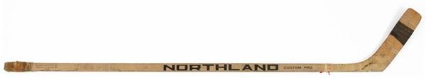 Northland stick used by Alex Delvecchio of the Detroit Red Wings in the early 1970s. Delvecchio played for Detroit from 1950 through 1974, teaming with Gordie Howe to form a potent offensive threat. Alex scored 456 goals and recorded 1281 points in over 1500 NHL career games, and was elected to the Hockey Hall of Fame in 1977. This Northland Custom Pro model stick has tape on the knob and 4 inches down the handle, and has only 4 wraps of tape around the straight blade. Only a few pieces of the celluloid red accent taping stripes remain. The stick is stamped with the Olympic Sporting Goods distributor name and “DELVECCHIO” in black. On the middle of the stick is Delvecchio’s autograph in black pen, slightly faded and grades 6-7 out of 10. The stick shows good game use with many puck and board marks and a chip of wood gone from the heel of the blade.