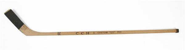Many claim Bernie “Boom Boom” Geoffrion invented and then perfected the slapshot. Regardless, he had one of the most powerful shots in hockey. As a member of the great Montreal teams of the 1950s and 60s, Geoffrion teamed with fellow Hall of Famers Jean Beliveau and Henri Richard to give the Canadiens a line that almost scored at will. During his tenure with Montreal, Geoffrion helped the team to 6 Stanley Cups, won Rookie of the Year honors in 1952, and led the NHL in scoring twice. This great CCM Custom Pro stick is taped on the knob and the straight blade. "GEOFFRION" and other manufacturer's and distributor's stampings are in black ink. The inscription “To Mike Green from the Montreal Hockey Club” is written on the stick near the knob. The 1963-64 Montreal team has autographed the stick in various color ink, with the signatures grading 3-4 overall. Included are Geoffrion, Beliveau, Richard, Backstrom, Balon, C. Pronovost, J.C. Tremblay, G. Tremblay, T. Harper, Ferguson, Hodge, Talbot, Hicks, Berenson, J. Laperriere and Toe Blake. The stick shows light game use with some of the tape worn off. A must for anyone interested in the great NHL dynasties.