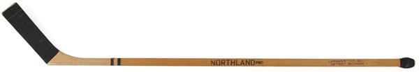 The Detroit Red Wings featured many great players in the 1950s, including Hall of Famers Ted Lindsay, Gordie Howe, Red Kelly, Terry Sawchuk (dec. 1970) and Alex Delvecchio, all of whom were instrumental in leading the Wings to the Stanley Cup in 1955. This Northland Pro model stick has the straight blade and the knob tapped. The celluloid accent taping is two black stripes. "LINDSAY" and other manufacturers and distributors stampings are in black ink. There are 21 autographs in blue on one side of the shaft. The signatures have faded to green and rate 3-4 out of 10 overall. Signatures include Lindsay, Sawchuck, Howe, Kelly, Pronovost, Delvecchio, Wilson, Pavelich, Leswick, Goldham, Bonin, Skov, Reibel, Dineen, Stasiuk, Hay, David, and Zeniuk, with trainers Matton and Wilson and coach Skinner. The stick is in NMNT condition. A fantastic piece from one of the great NHL teams of the 1950s.