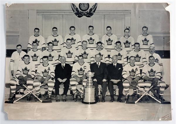 Glorious Lou Turofsky photo of the 1947-48 Stanley Cup Champion Toronto Maple Leafs. After vanquishing the Red Wings, the boys, wearing ear to ear grins can't hide the joy of owning the most revered trophy in all of sport. Captain Syl Apps and the Cup are the centerpiece, surrounded by the likes of Conn Smythe, Ted Kennedy, Howie Meeker, Max Bentley, Wally Stanowski, Harry Watson and "Turk" Broda. The photo measures 13X20 and was probably the possession of one of the players. A rare aspect of this historic picture is that it is signed Turofsky Photo on the front in sepia colored ink. There is damage to the corners, some slight tears but overall an awesome and important display of NHL history.