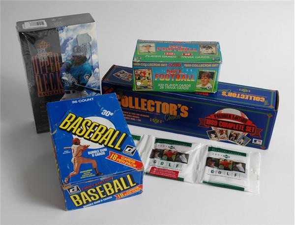 Massive collection of unopened material of the modern era, rookie cards, star singles,and autographs. 1) 1991 OPC Baseball wax box 2) 1992 UD Baseball wax box 3) 1994 Topps Traded factory sealed set. 3) Signed Bobby Hull newspaper page. 4) Approx. 3000 asst. cards all pre-79. 5) 1988 Topps Baseball rack pack box. 6) 1986 Topps Baseball rack pack box. 7) 1984 Topps complete set (NR-MT). 8) 1989 UD factory sealed set. 9) 1989 Fleer Update factory set. 10) 1989 Score Rookie Traded factory set. 11) 1991 Score Rookies factory set. 12) 1990 Topps Traded factory set. 13) Two 1983 Fleer grocery packs. 14) Two 1986 Topps rack packs. 15) 1984 Topps rack pack. 16) 1984 Fleer cello box. 17) Seven 2001 UD/SP Golf rack packs. 18) Twenty two 1987 Leaf/Donruss wax packs. 19) Topps Football wax run (Two each of 1980, 1982, 1983, 1987). 20) 1981 Donruss wax box. 21) 1990 Topps rack pack box. Also includes individual rookie stars like McGwire, Iverson, Yzerman and much, much, much, more.