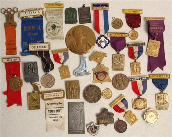 Medals, ribbons, and pins awarded to and collected by George V. Brown. Brown was a noted track umpire in the 1920s and 1930s, and a highly influential person in sports. His brother Walter was owner of the Boston Garden, Bruins and Celtics. The collection includes 21 medals and ribbons for track and field judging. The earliest appears to be from 1921, and they range from local Boston Area meets to Nationals to international competitions. Notable among these are his badges from the 1932 (ribbon missing) and 1936 Olympics and the 1936 British Empire Games. There are an additional 18 pins, medals and ribbons presented to or collected by Brown, including several for hockey events and the Ice Capades. Also included in this lot is a small bag of 1960s-70s Olympic, NBA, NFL and other pins. Finally, there is a 2” x 3 ?” black and white photo of a Roosevelt for President advertising truck. Most of the items in this lot are VG. They show normal wear for their age, with the ribbons having folds, creases, etc. Obtained directly from the Brown Family.
