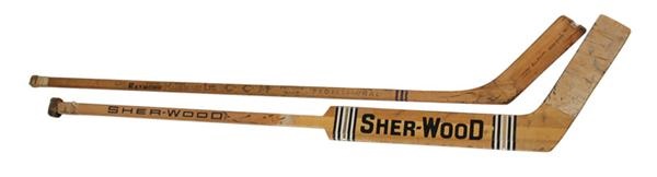 If you put these two players on the ice, a five on two powerplay would come up empty. Doug Harvey was one of the top five defensive defenseman ever to lace a pair of skates. He earned some of that praise carrying the stick we present. Used during the 1955-56 season is his CCM Pro Extra Special. The stick bears the Ernie Evernden custom stamp on the blade. The original tape on the butt end remains untouched after fifty years. Marked Raymond Sporting Goods on the shaft along with custom made,Harvey, #2. Top that off with about 15 vintage team signatures which include: Beliveau, Geoffrion, Rocket Richard, Olmstead, Curry, Marshall etc and this is one grand slice of Hab's folklore. And just for a bonus, the second part of this two piece collection just happened to belong to a goalie named Ken Dryden. The Sherwood wide body is all original from the1976-77 season. The tape on both ends were never touched and bear the marks of many denied goals. Marked 29 - K. Dryden on the shaft, this is a beauty. About the best defensive pair of game used sticks you will ever see.