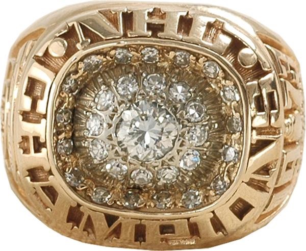 Lafleur was still a budding "Flower" in '73 when he recieved this, his 2nd Stanley Cup ring, after Les Canadiens turned back the Balckhawks in 6. Only in his 2nd season, the high-flying Lafleur was only just beginning his spectacular NHL tenure, which in '74-75 would see him become the 1st to notch 50 goals in a season, first to score 60 ('77-78), and first to get at least 50 goals and 100 points in 6 consecutive seasons. Want more? Lafleur's career marks include 560 goals and 793 assists, but it was during the postseason that the flower really sprouted -- he scored an amazing 58 goals and 76 assists in 128 games. He also was named to the NHL first team All-Stars 6 times, won the Art Ross Trophy 3 times, the Lester Pearson Trophy 3 times, the Hart twice, the Conn Smythe in '77. With Lafleur the spectacular became almost monotnous. Not only was he elected to the HOF in 1988 -- he came back to play after his induction, briefly, in '88-89 and '90-91. What Wayne Gretzky was, Lafleur got there first. Not bad for a guy with a 2-pack-a-day cigarette habit. The gorgeous, shimmering 10K gold Jostens ring is clustered with diamond shavings around a central stone. The corona is engraved "NHL Champions". One shank reads "1973 Coupe-Stanley-Cup" under an image of the Cup and "Le Club Ice Hockey Canadien" underneath. Other shank has "Lafleur" etched into a band above the Canadiens' "C" logo and "Chamions Est-East 52-10-16". Lafleur's name is also engraved in script on the inside of the ring. Size 11.75. This was Lafleur's ring until he sold his Mack Truck-sized collection years ago through Lelands.com. All diamonds are real and the ring is absolutely NRMT.
