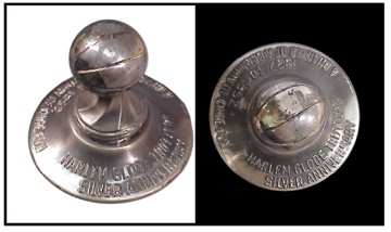 Diminutive silver-plated prize was presented to a member of the clowning basketballers. Raised lettering running the circumference of the base reads, "Harlem Globetrotters Silver Anniversary, 1927-1952, A Quarter of a Century of Cage Fun." Some tarnishing and a flat spot in the basketball on top, VG-EX.