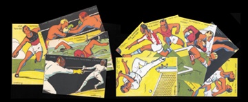 Gorgeous and colorful graphics on these original vintage cards from the "Jeux Olympiques." Each features a different event, including boxing, soccer, tennis and sprinting. All are unmarked and stunning NRMT-MT.
