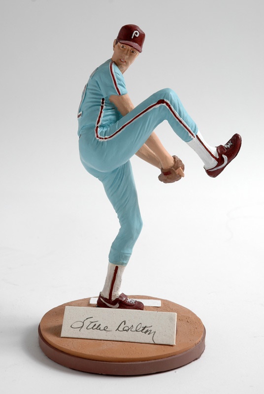 Steve Carlton knew how to win. He delivered with force and he delivered with finesse. This combination crafted 329 career victories, 4136 strike-outs and four Cy Young Awards. Although he issued few passes himself, his ticket is stamped at the Baseball Hall of Fame. His limited edition (1054/3290) ceramic likeness is in NRMT condition and signed on the base in black felt tip (9/10).