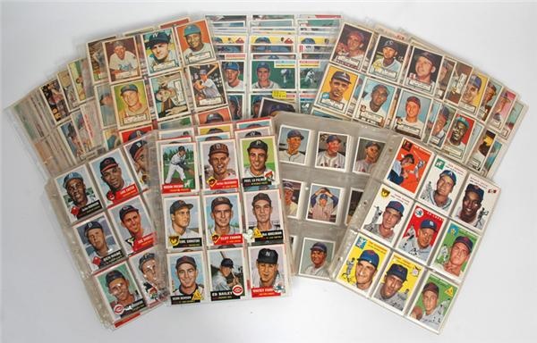 Complete reprints of three top-dollar Topps sets from 1952, 1953 and 1954, each card individually mounted in plastic sleeves grouped 9 to a side. This shank of the '50s collection includes repros of all the biggies of the time -- Mantle, Mays, Robinson, Rizzuto, Reese, Irvin, Doby, Spahn, Hodges, Roberts, Roe, Snider, Campanella, Mathews, Wynn, Ashburn, Page, Lopat, etc. Complete Brooklyn Dodger team runs from each year. Cards are NRMT and make for a perfect retro collection.