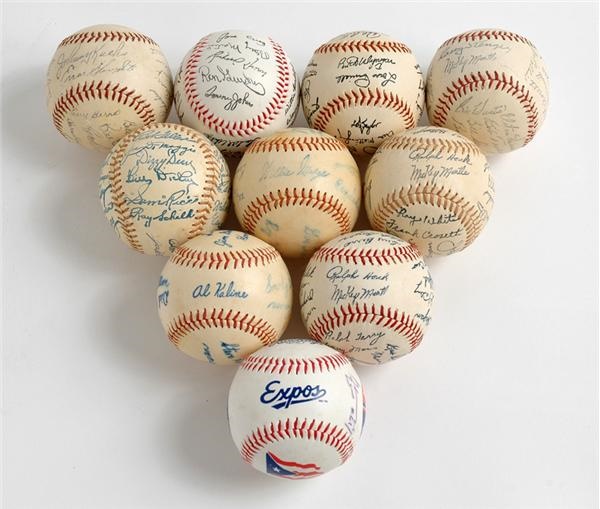 Four decades (1950's-80's) of Yankee teams and greats dominate this collection of facsimile signed baseballs. Mantle makes multiple appearances throughout along with several cameos from the likes of Ruth, DiMaggio, Gehrig, Grove, Mattingly, Winfield, R. Jackson, Dickey, Feller, Dean, Traynor, J. Robinson, and other HOF"s. Overall EX+.