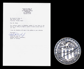 Sterling silver medallion was flown to the moon and is one of the few "official" 100% verifiable authentic flight-carried pieces you will ever see. One side is the logo of the mission featuring the astronaut's names John W. Young, Kenneth Mattingly II, and Charles M. Duke, Jr. The sixteen stars represent the Apollo number and the NASA "vector" logo for the teamwork and spirit of this mission. Verso, "Launched Apr. 16 1972…Landed Apr. 20, 1972…Returned Apr. 27, 1972." This gorgeous 1.25" Robbins is known as such for the company's involvement dating back to Apollo 7. Marked on the side with their "R", "Sterling" and the number "37" (as in the LOA) from a limited edition of 98 that were actually flown to the moon. In original box with "37" label on verso. 1993 LOA signed by "Charles M. Duke, Jr. Brigadier General USAF Apollo 16 Astronaut". States, "The enclosed Apollo 16 Medallion number 37 was flown to the moon by me during the flight of Apollo 16 which occurred April 16-27, 1972." Also comes with an excellent book devoted to these historically significant medals which have sold for tens of thousands of dollars. Mint.