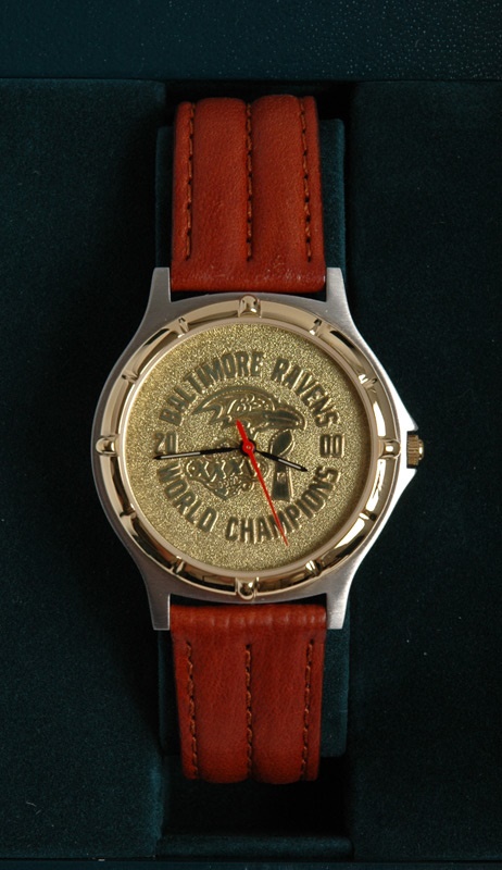Manufactured by Jostens, this handsome timepiece was created to commemorate the first Super Bowl victory in Baltimore's short franchise history. The raised lettering of the gold face reads "Baltimore Ravens-2000 World Champions" with team logo, "Super Bowl XXXV" logo and Lombardi Trophy design. Accented by a brown leather band with attractive top stitching the watch, in its original box, is in Mint condition.