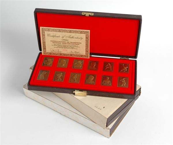 Offered are three bronze mini-card (1.25"x1.75") sets from Topps featuring the brightest stars of the 80's. 1) 1986 complete 12-card bronze set in its original leather case with pewter Mattingly premium (only issued as a premium to those ordering the set.) Mint. 2) 1987 complete 12-card bronze set in its original leather case with Boggs, Schmidt, and Clemens. Mint. 3) 1990 complete 12-card bronze set in its original leather case with Yount, Puckett, and Ryan.