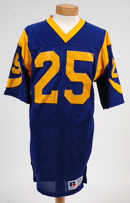 A third Pro Bowl nod came this year for the star Los Angeles defensive back, who put devastating wear into the offered blue mesh gamer. Team repairs abound! His number "25" screened on chest, back, and sleeves in yellow; "Gray" is in white block on shoulders. "Russell Athletis [size] 46" label in tail is written with year "8" as in "88." "100 % Nylon" flag tag below. Signed on verso in perfect black sharpie. LOA.