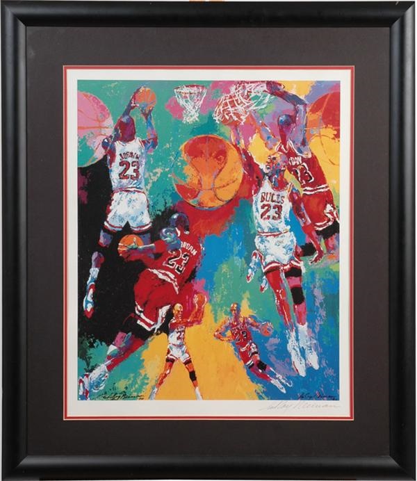 MJ was clearly one of Neiman's favorite subjects as he is once again captured here unleashing his entire arsenal of offensive ability. Signed by the artist in black felt tip (9/10).Double-matted and framed to 31"x37"