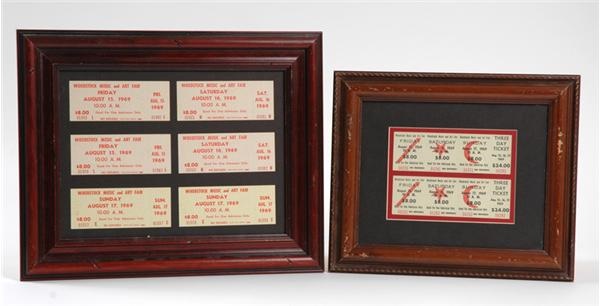 Six single day tickets from the historic music festival that defined a generation, two each from Friday August 15th, Saturday the 16th, and Sunday the 17th of 1969 are joined by two complete "Three Day" passes. All are unused and fully intact, overall EX-MT. Mounted and framed to 10.5"x13" and 12"x16".