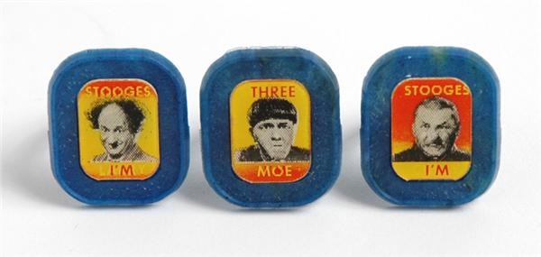 Complete set of flasher/flicker rings, manufactured by Walt Disney Co., stars the classic comic trio Moe, Larry, and Curly. Each ring face measures 7/8" x 1" and bares an alternating image of an individual Stooge in black and white on a colorful background. EX-MT.