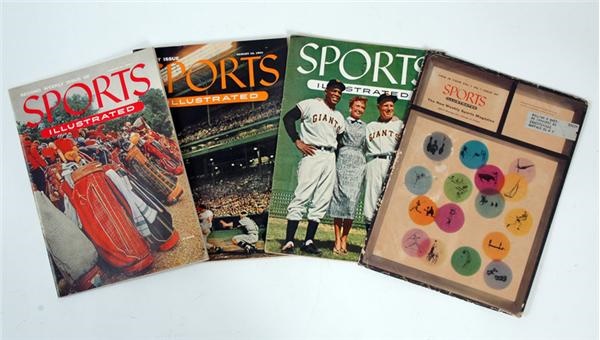 Highlighted by the August 16, 1954 inaugural issue (Eddie Mathews on the cover) with its original mailing envelope (VG) this trio of early Sports Illustrated magazines also includes issue #2 (August 23,1954) and an April 11, 1955 specimen with Mays on the cover. Each publication owns clean pages and vibrant color on the covers, EX-MT-NM.