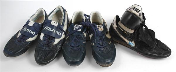 A collection of cleats boasting tremendous game use logged during countless innings with a trio of New York legends. 1) Boggs' black Nike cleats are signed in blue sharpie along the white "Swoosh" on each shoe and written with his number "26" in black sharpie above the heel. Size 11. 2) Strawberry's navy Nike cleats are written with his number "12" on the heel of each. Size 11. 3) Navy Mizuno cleats, worn and signed by Sierra, are written with his number "21" on the lace guards in black sharpie. Size 10.5. Includes LOA.