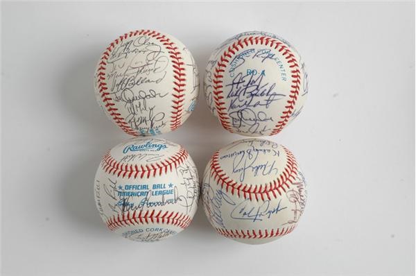 These four (4) balls will make Birdland buffs run, not walk, to Bid-land. The team signed balls are from 1987 (26 sigs), 1988 (30), 1989 (29) and 1991 (26). Cal Ripken Jr.'s valuable marker is on all of them, and graces the SS of the '87 ball -- when he was player-manager before giving way to Frank Robinson 6 games into the '88 season; Robby's sig is on the SS of the other balls. Overall EX-MT.