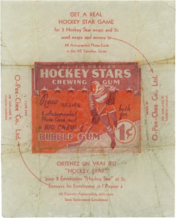 Hockey Stars one-cent wrapper with attractive duel color graphics and text once held one of the forty-eight autographed photo cards of the All Canadian Series. Creases most noticeable along side and back panels, front corners are worn through, GD-VG.