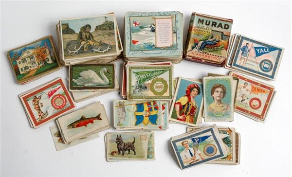 This cache of mostly non-sports tobacco cards from the early 20th Century reflects an era of simple leisure-time pleasures. Cards came in cigarette and cigar packs with brands like Hassan, Murad, Turkish Trophies, Fez, Fatima, etc. and include motifs like wild animals, (mandrill, orangutan, etc.), college life (Amity, Drake, Marquette, etc.), battleships, words of wisdom ("Change of Scenery Will Be Beneficial"), state flags (Texas, New Hampshire, Arkansas), country crests (Egypt, France, Brazil), and so on. Also vintage gag card from "Cowflops Cigarettes" reading: "A fine blend of domestic crap and imported dreck. Have one! If they don't cure your halitosis don't blame it on Cowflops." Bonus: an original Murad Turkish Cigarette box, 2.5 x 3", G-VG with 1 flap torn off and overall damage but still a colorful example of this rare brand. Hundreds of cards in all, mostly VG-EX.