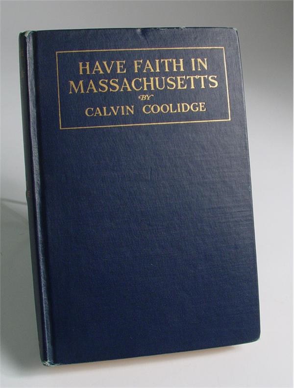 Although "Silent Cal's" political genius was his talent for effectively doing nothing, the 30th President (1923-29) was a man of high integrity, and when time came for a 2nd term, he intoned, "I shall not run." Such bedrock principles were honed when Coolidge was Massachusetts governor from 1919-1920, when he wrote Have Faith in Massachusetts, a collection of his speeches. He signed this copy inside the cover in black fountain pen (grade 9/10) in 1920, shortly before he ran for president but settled for being Warren Harding's running mate. He was thrust into office when Harding died in August of 1923. With the Mint book is a draft of a nominating speech for Coolidge at the 1920 GOP convention, evidently written by Coolidge himself.
