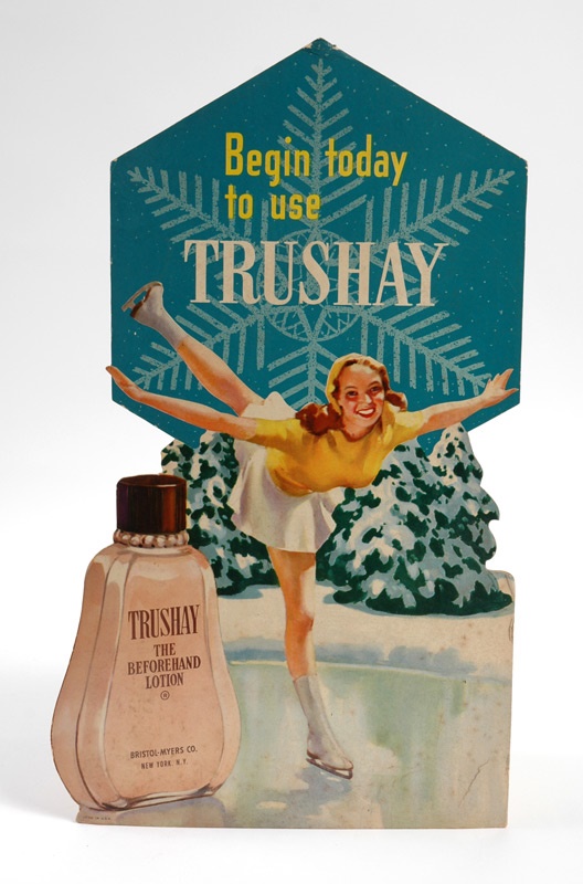 This was the image that the world fell head over heels for in the '30s and '40s, though that was surely not a position Sonja Henie found herself in. Her graceful turns on the ice define this classic die-cut poster for Trushay skin lotion from the '50s, long after she had parlayed her two-time Olympic gold medal performances into a Hollywood movie career playing, what else, ice-skaters. 19.5" tall cardboard poster is 11.25" at its widest across the bottom. Ms. Henie racing across the ice like a comet, her blond curls circling her head like a halo, a pastel winterscape behind her. Cleverly cut piece is EX with some wear of the edges and overall soiling but the colors are strong. Back has affixed stand.
