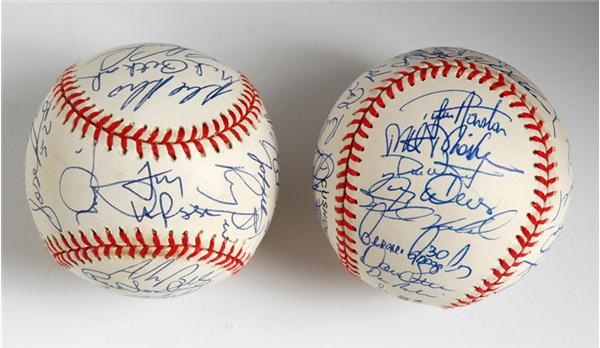 Shot for shot, back and forth, month after month. The homerun race of '98 rekindled America's love for the game and elevated two phenomenal players to the level of legends. Offered are two snow white blemish-free ONL (Coleman) baseballs signed by slugging stars McGwire and Sosa and their supporting casts. St. Louis Cardinals team signed ball(27 signatures): McGwire, Gaetti, DeShields, Clayton, Gant, Jordan, Lankford, McGee, Stottlemyre, Hunter, Drew, McEwing, and Lampkin. Cubs (33 signatures): Sosa, Wood, Trachsel, Grace, Blauser, Johnson, Merced, Servais, and Orie. Both autographs and balls are Mint.