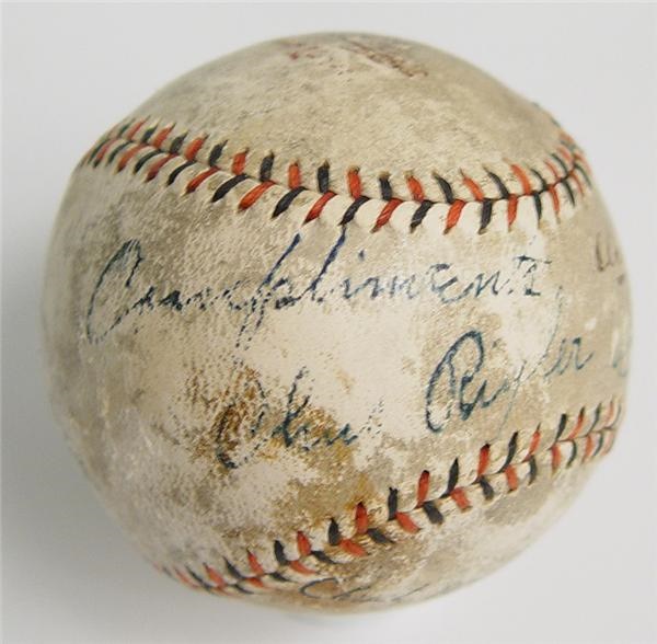 Christy Mathewson was arguably the greatest pitcher in the history of the game. Matty, as he was affectionately known, finished his career with 373 wins and an amazing 2.13 ERA, earning himself a place in Cooperstown during the Hall of Fame's first election. While Mathewson's accomplishments on the mound are well known, and often discussed, many fans are unaware that the great hurler finished his Baseball career with the Cincinnati Reds, serving as their Manager from 1916 until 1918, when he left to join the service. Presented is an Official National League baseball (Tener) signed by Christy Mathewson during his tenure as Cincinnati's skipper. The scuffed and soiled sphere (quite possibly game used) features a second signature, that of Umpire and Hall of Fame candidate Charles "Cy" Rigler on the sweet spot, as well as the date "Aug-25-18" penned in vintage fountain pen ink. This date of August 25, 1918 is important, as research has shown that this day was Mathewson's last as Cincinnati's manager, with his official resignation from the team coming on August 27th. Moreover, it has also been documented that on this very day the Cincinnati Reds played the Boston Braves in a double header during which Cy Rigler served as umpire. The provenance of this remarkable piece is further substantiated by an accompanying letter from a long time Cincinnati resident and owner of the ball, who details its history. The Cy Rigler autograph on the this amazing relic is accomplished in blue fountain pen ink and reads, "Compliments Chas. Rigler umpire". The signature appears a bit rough in few spots due to surface scuffs on the vintage hide, but remains fully legible and rates 7-8/10 in strength. Mathewson's signature is situated on the panel below Rigler's mark and, although it remains dark and legible (also 7-8/10 in strength), appears to have been enhanced at some point in black fountain pen ink.While Christy Mathewson autographs are scarce in any form, they are exceedingly rare on baseballs, with this example being one of only a handful we have ever offered. In addition, the signature of Umpire Cy Rigler is quite a treasure in its own right, as Rigler was a popular umpire whose autograph seldom surfaces, as he passed away in 1935 at the age of 53.