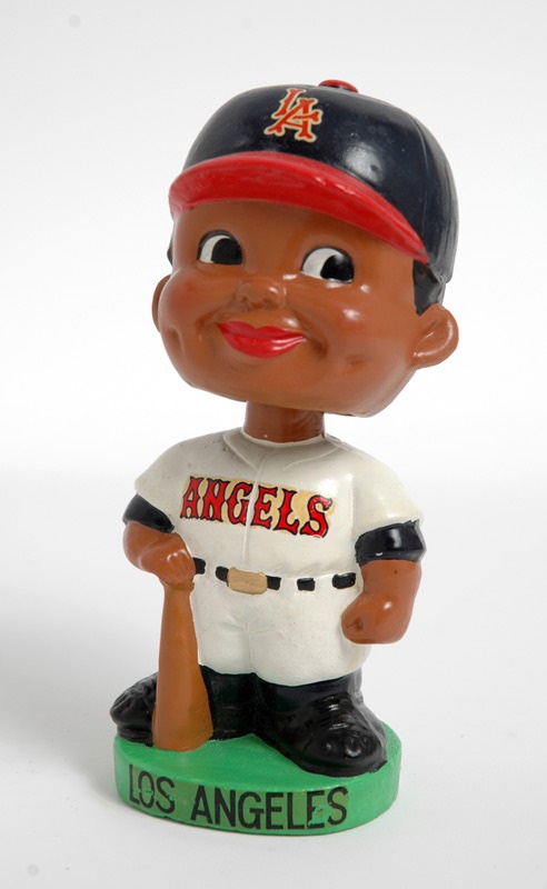 L.A. Angels "black face" bobbin' head from the team's second year in existence is a near-perfect example of the politically-incorrect baseball-player dolls sold in 1962 before they were sent to the showers. 6 1/2" tall doll has "Angels" across the chest in red and a blue and red "LA" cap. Green oval base reads "Los Angeles." Underside has the made in Japan stamping and the year. Doll is NRMT and has been restored around the neck area though you can't tell with the naked eye.