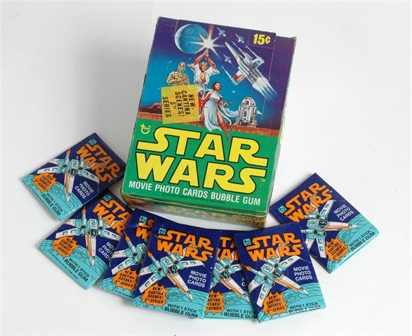 Hermetically sealed 1977 Star Wars wax box wrapped in cellophane looks as fresh as Carrie Fisher did back then (check out her picture on the side alongside Mark Hamill). 5th series box with "New Cantina Scenes" sticker on top, but may contain 4th series packs as well. A red blurb on the side reads "4th Series Extra -- Sticker in Every Pack." Green-yellow 36-count box is NRMT with soiling only on the underside.