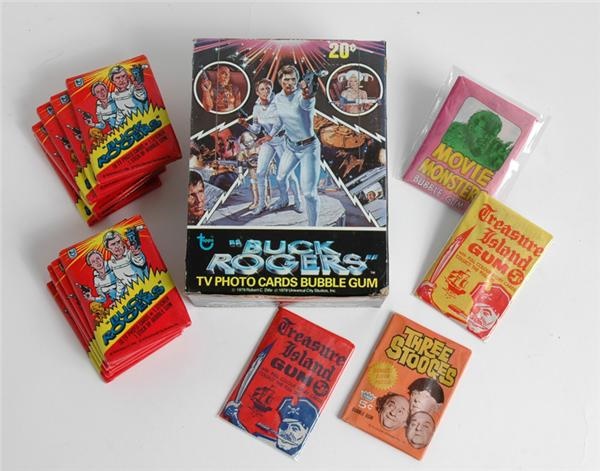All unopened lot includes 1) 1979 Topps Buck Rogers TV Photo Card wax box (36 ct), 2) 1960s Fleer Three Stooges pack, 3) Topps Movie Monster pack w/Hulk on front, 4) two (2) Grant Treasure Island packs, one red/blue, one yellow/red, with pirate hoisting a sword on front. All items EX-MT.