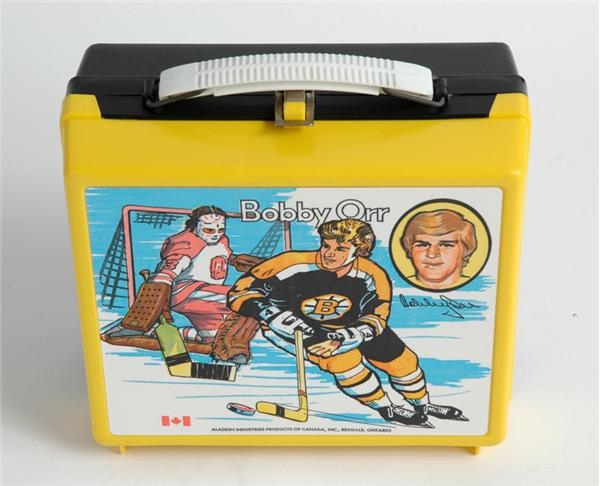 Two-tone lunchbox with original thermos are both covered with colorful illustrations of hockey's first offensive defenseman. Minor scratches to the exterior of the black portion and minor paint loss to thermos, EX+-EX-MT. Manufactured by Alladin Industries of Canada.