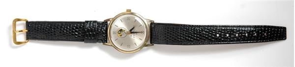 This 1971 Pirates world championship watch has the distinction of having been awarded to Roberto Clemente, the MVP of the 7-game World Series against the Orioles. Two days later, Clemente gave the watch to his close friend and public relations assistant Ramiro Martinez in the lobby of the Sheraton Hotel in Pittsburgh, where several of Roberto's friends were staying. Watch has the Buc logo and "World Champions 1971" and an alligator-style leather band. Very slight tarnish on the gold corona, o/w EX+. Includes photo scan of Martinez with the watch and comes with original black and gold Sheaffer box, VG w/damage on the interior. Great piece, and yet another story of Clemente's generosity. LOA.