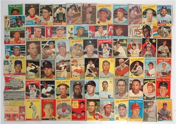 Tremendous hoard of hundreds of Topps cards from the '50s and '60s is a great faces-in-the-crowd collection-filler that includes both HOFers ('58 Early Wynn #100; '58 Ernie Banks "Hustler Banks Wins MVP Award; '58 Willie Mays "Master and Mentor", '60 Walt Alston), thrilling-moment-makers (Harvey Haddix, he of the 12-inning perfect game defeat), classic victims (Chuck Stobbs, who gave up Mantle's 565-foot homer), great alliterative names (Rip Repulski), important off-field figures (Curt Flood), the Yankees' keystone combo ('58 Kubek & Richardson), the ugliest man to ever play (Don Mossi), and much more! Other names taken at random: Chuck Cottier, Gene Stephens, Dick Ricketts, Ed Sadowski, Gus Bell, Harry Simpson, Sam Jones, Eli Grba, Don Zimmer, Tito Francona (Terry's dad). Condition averages VG-EX. Obviously, great breakup potential here.