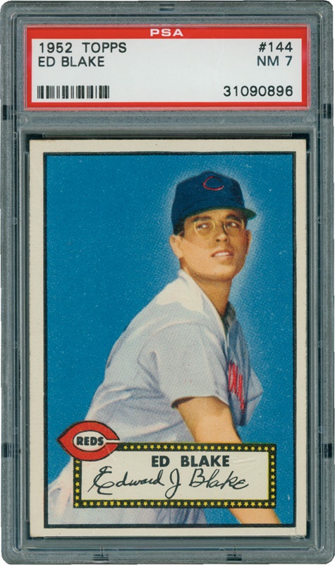 An arcane card for the serious collector. Blake's 1952 Reds card (#144) is rated PSA 7 NM with quite strong corners and a deep blue background to his bespectacled image. Centered slightly to the right and nearly invisible wear at top left corner. Great to add when moving toward completing a set.