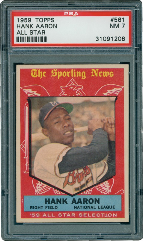 The back of Aaron's 1959 Topps All Star card (#561) reads, "Hank's on his way to becoming one of baseball's greatest righthand hitting outfielder." With the same understatement, we say this card would do any collection proud. Card has a gorgeous red background and only a slight left-of-center placement keeps it from grading higher. Still, an early card of the future Home Run King at this price is a boon to "on the way" collections and to all Aaron memorabilia hunters. Graded PSA 7.