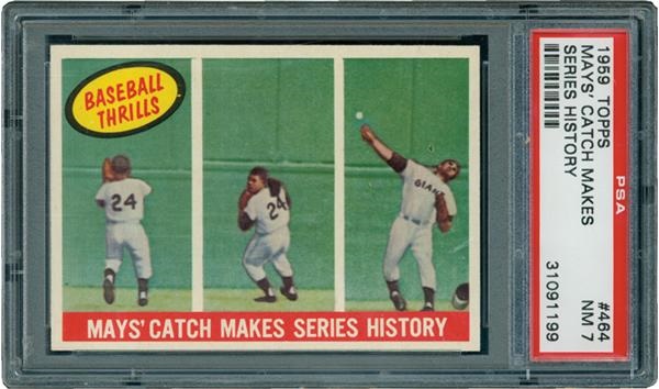 This 1959 Topps "Baseball Thrills" card with a 3-image sequence of the Say Hey Kid's famous catch in the '54 World Series has been graded PSA 7 NM -- a very conservatively grade for this very pleasing card almost perfectly centered, clean as a whistle and corner-strong. We don't think anyone will have a bone to pick with it, yet the grading means it can be had for a song. What a catch!
