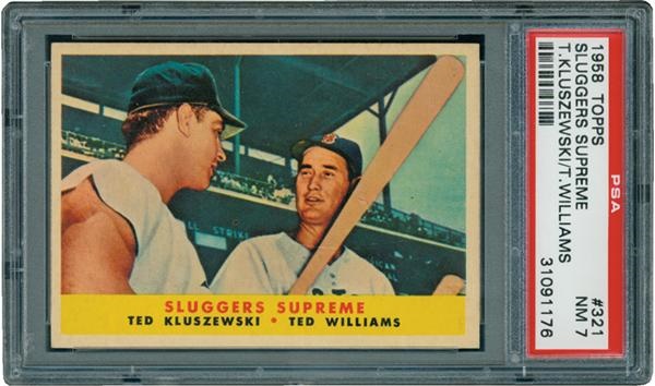 Topps 1959 Sluggers Supreme series card pictures Ted Williams and Ted Kluszewski, with Big Klu's massive left bicep under his cut-off sleeve a frightening sight to behold. Even the Splinter looks a bit taken aback. Great color rotoscope image on a great card that is rated PSA 7 NM and is slightly left-centered but retains no visible damage.
