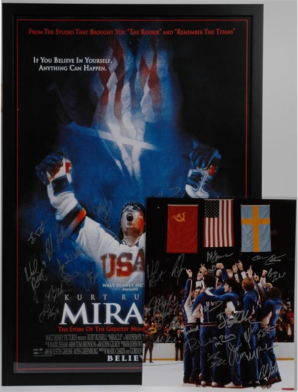 Americans still can't get enough of the 1980 U.S. Olympic hockey team, the eternal symbol of overachieving thanks to their "Miracle On Ice" against the big bad Russians. This lot of signed memorabilia -- with each piece signed by 20 of the "boys of winter" -- includes 1) a 16 x 20" photo of the team in a group hug on the medal platform, index fingers held high. Silver sigs, photo NRMT. 2) a team-signed Official 1980 World Series ball. Blue ink sigs and snow-white ball NRMT. 3) a framed 28 x 40" poster for the Disney flick "Miracle" starring Kurt Russell, with the Jim Craig character basking in the glow under an American flag. Sigs (in appropriately gold ink), poster NRMT and framed. All the biggies -- Craig, Eruzione, Morrow, Christian, Broten, Silk, Suter, Verchota, Baker, Johnson, etc.