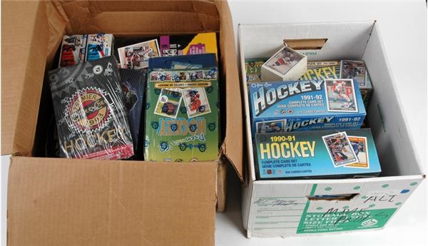 The fall of 2005 will see the much anticipated return of NHL play throughout North America. This lot contains (13) factory sealed sets: O-Pee-Chee ( 90-91; 1991-'92; (2) 1992 Premier; 1991 Premier including Seregi Federov Rookie & 1993 Premier); Topps( 1991, 1992, (2)1990, 1990 Bowman & two(2) 1991 Bowman). There are also (18) factory sealed boxes including: 2000-01 Topps Chrome, 1994-95 Finest, two (2) 1991 Stadium Club, two (2) 1992 Series 1 Stadium Club, 1992 Stadium Club Series 2, 1993 Stadium Club, 1993-94 Stadium Club Series 2, 1993-94 Topps Premier, 1993-94 Topps Premier Series 2, 1994-95 Topps Premier Series 1, 1990 Bowman, 1991 Topps, 1993-94 O-Pee-Chee Series 1, 1993-94 O-Pee-Chee Series 2, 1992 O-Pee-Chee Premier & 1993 O-Pee-Chee Premier. All boxes in EX condition with exception of 1991 Stadium Club which shows slight wear. Most set/boxes are in original factory cellophane wrap.