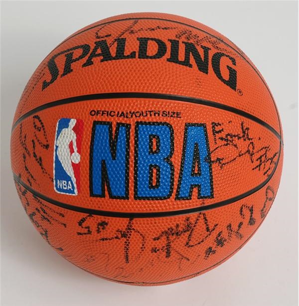 Obtained at the Topps NBA Rookie photo shoot for the '96 top draft picks by a former trading card marketing exec, this Official Youth Size Spalding Basketball is saturated with over 20 signatures from that prize crop of talent. Includes cream of the crop like Stephon Marbury, Jermaine O'Neal, Derek Fisher, John Wallace, Eric Dampier, Todd Fuller, Tony Delk, Dontae Jones, Roy Rogers, Brian Evans.etc. Sigs are in black marker and average 7/10. Ball is NRMT and a unique display piece. Fans of Steph in particular will love his oversized autograph.