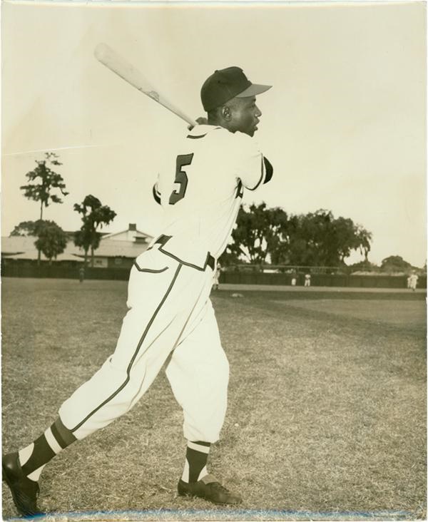 You know how vintage this 8 x 10 of Hammerin' Hank is by the number on his back -- not the famous "44" but a weirdly incongruent "5"! There aren't many of those around. Photo dates way back to his first Braves training camp in 1954 when he unleashed the swing that would rewrite put 755 balls into orbit. Photo VG-EX with some shagging of the edges and corners but displays wonderfully and comes with the original full-sized negative.