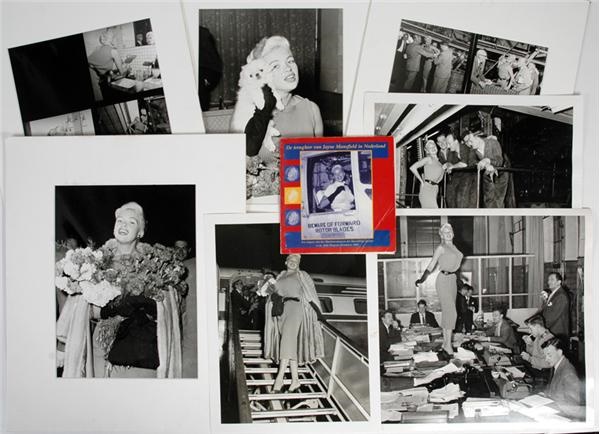 It was said of Jayne Mansfield that her talent was under her sweater. And the platinum blonde screen vixen used her humongous hooters and Marilyn Monroe looks to land screen roles which while forgettable made her a sensation, particularly in Europe. These 7 oversized (what else?) photos were snapped by famed Dutch photographer Auke Bergsma during a whirlwind Mansfield tour of that country in 1957. The shots show off her considerable assets in a variety of poses with the locals -- including a 16 x 20 of her standing on a table as reporters try somehow to do their work. Four pieces are matted. Photos mainly NRMT, notably the matted ones. Includes a Dutch book in which the photos were used and can be seen, though some pages are stuck together.