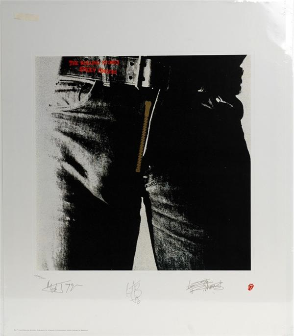 Three kickin' limited edition Stones posters with the signatures of the now geriatric bad boys on the white border underneath in dazzling gold marker. Posters taken from classic album covers include 1) "Sticky Fingers", w/the famous image of Jagger's package bulging through his jeans and gold zipper that opened on the album cover. 23.5 x 27", signatures of Jagger, Watts and Richards, numbered "4964/5000". From 1994. 2) "Tattoo You", w/front-back images of Richards and Jagger in face paint. 22 x 35", with added signature of Ron Wood, numbered "3905/5000." From 1998. 3) "Stripped", w/late-model Stones in shades, 23.5 x 28", numbered "52/2500." From 1995. All signatures and posters NRMT or better.
