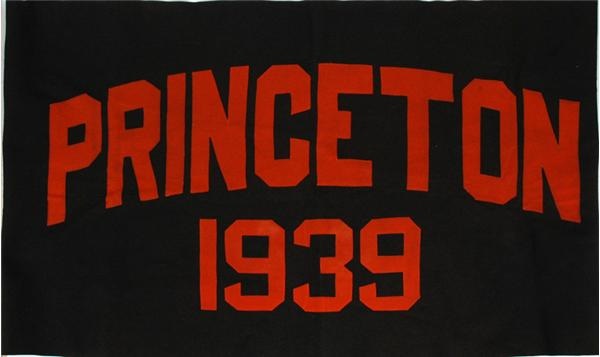 A brief stint but he was there. John F. Kennedy was admitted as a member of Princeton's class of 1939, but left campus after becoming ill and later enrolled at Harvard University. 32 x 67" black wool banner proudly embroidered in red "Princeton 1939", which may have festooned the football stadium that season, perhaps during the victory over hated rival Yale. The fact that the banner stems from the last year of that decade lends some added heft, since the Tiger dominated that period, and the '35 edition of the team has been called the best college team in history. Of note as well, the first TV broadcast of a football game occurred at Princeton that same year. Blanket is so thick and plush that it could have been used as a blanket with which to kidnap the Harvard or Yale mascot. Banner is EX+ with tears on the upper right and lower left corners.